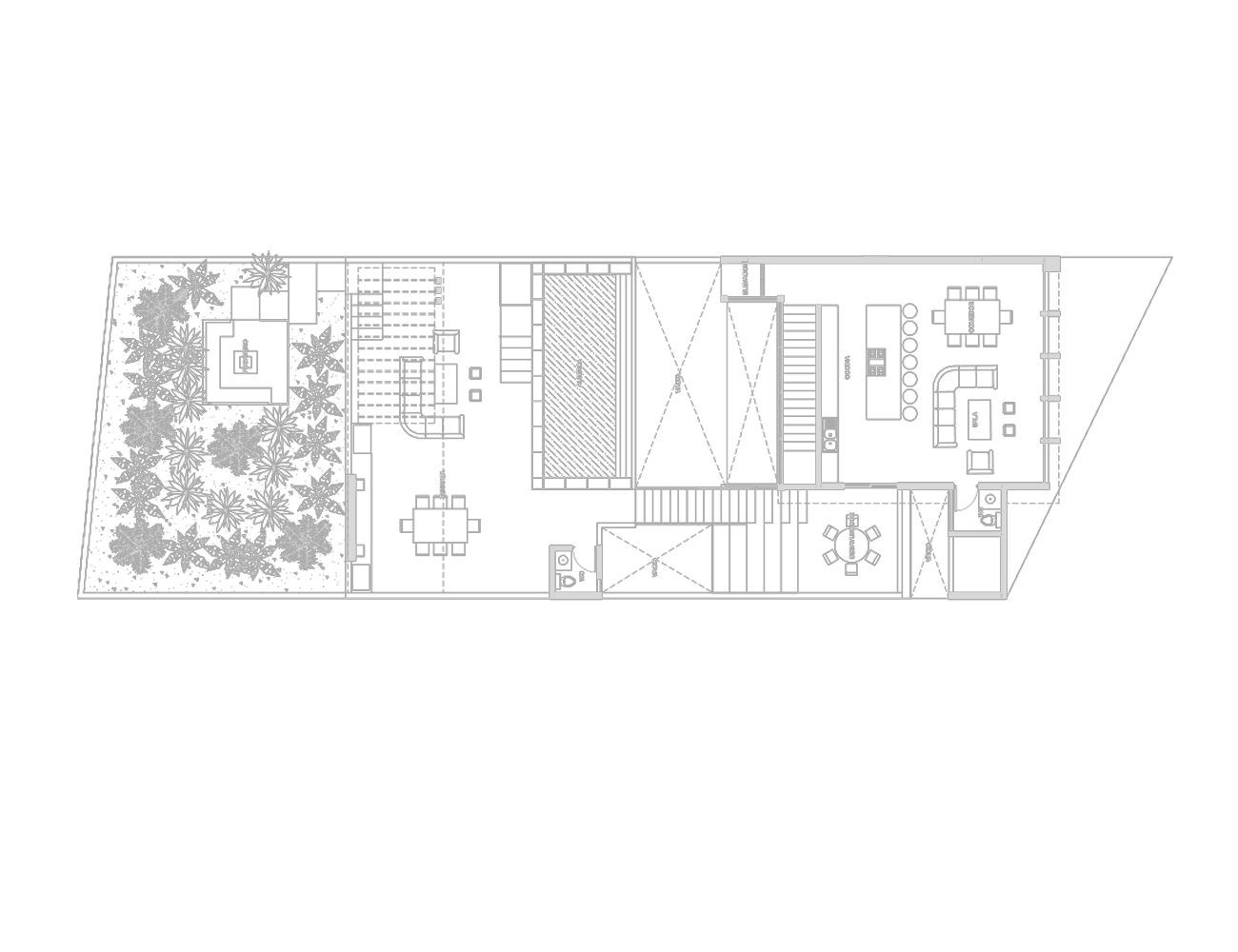 Villa on 3 levels: access level has an office-library, waterfall and triple-height water mirror, master bedroom with bathroom and walk in closet, TV room, outdoor breakfast area and roof garden with pool, bathroom and fire pit.