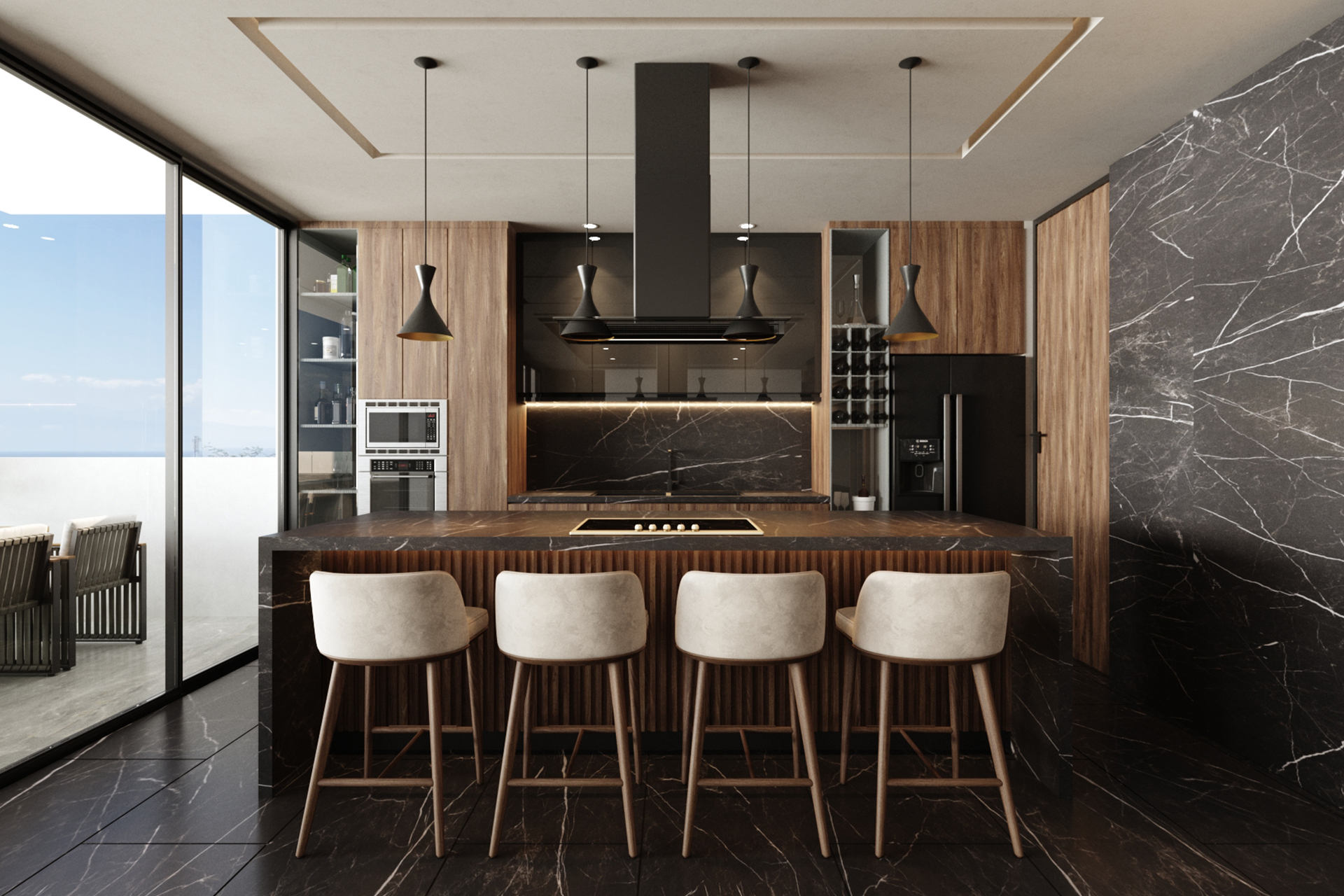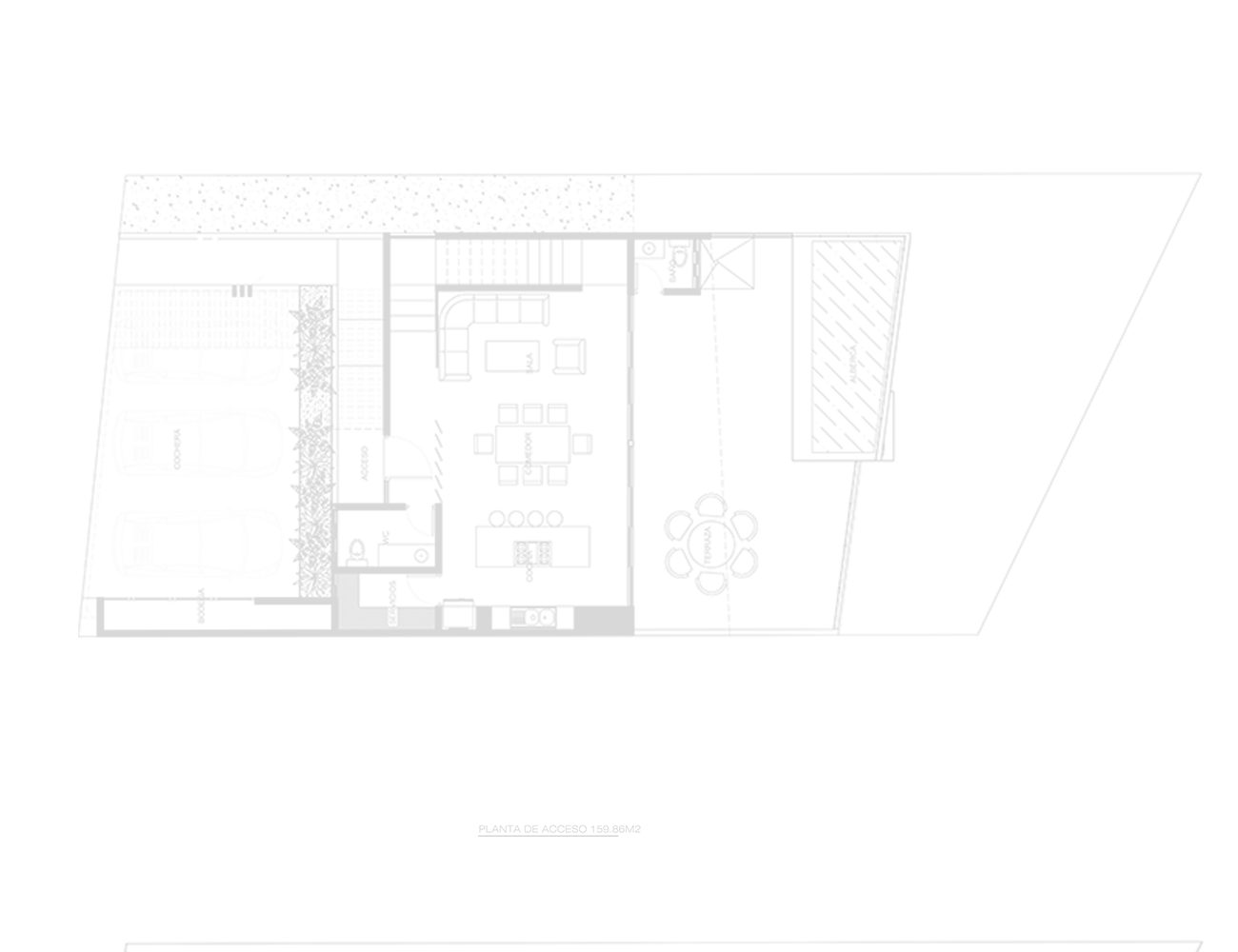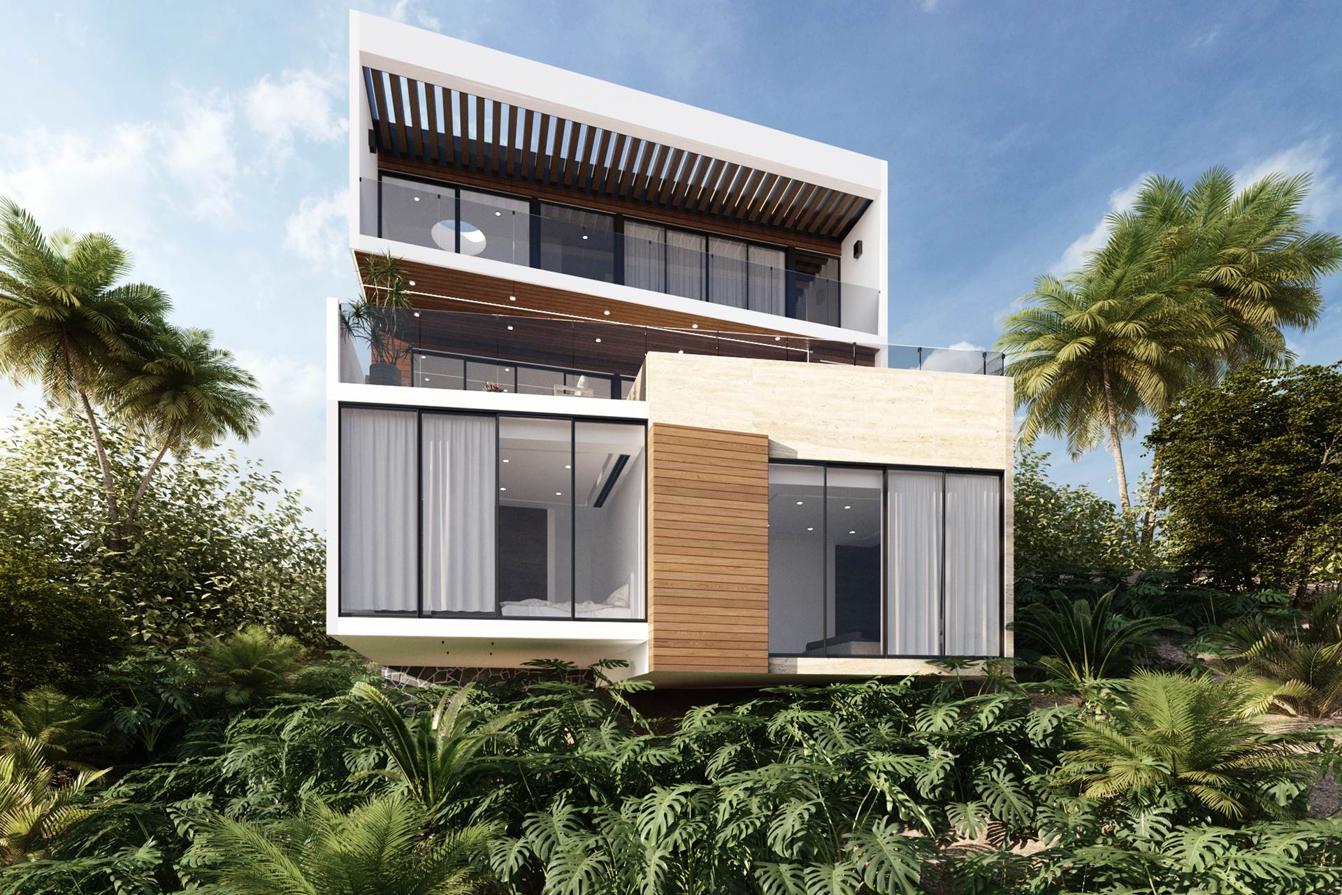 Villa with three levels, garage for three cars, access through an intermediate level to a social area, terrace, bathroom on the terrace and pool, master bedroom with walking closet and bathtub. Two bedrooms with bathrooms and closets.
